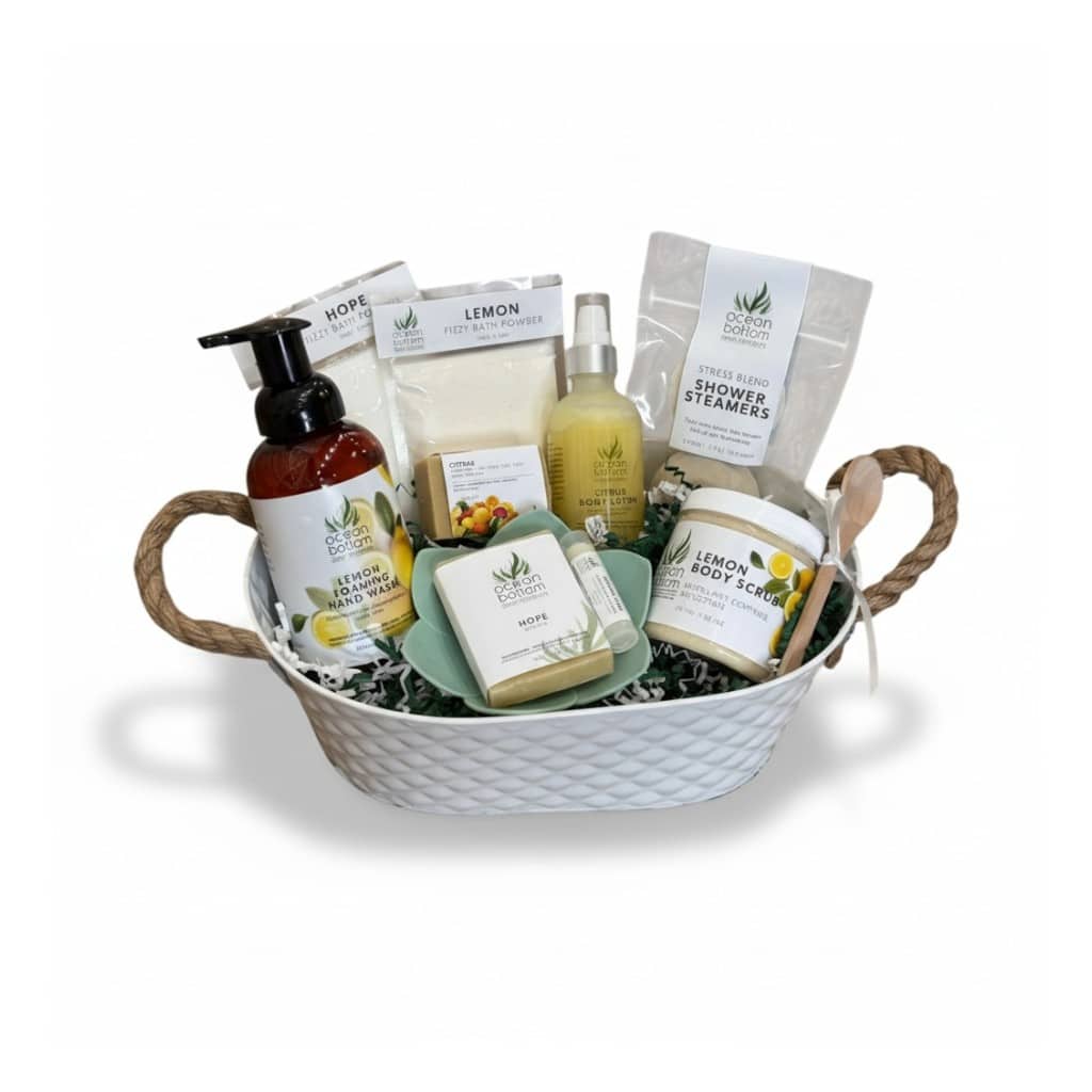 This thoughtfully curated basket features a variety of Ocean Bottom essentials designed to gently cleanse, nourish, and refresh the skin. From our Lemon Foaming Hand Wash and Citrus Body Lotion to fizzy bath powders, artisan soaps, and an exfoliating Lemon Body Scrub, each product offers a bright and invigorating citrus experience.