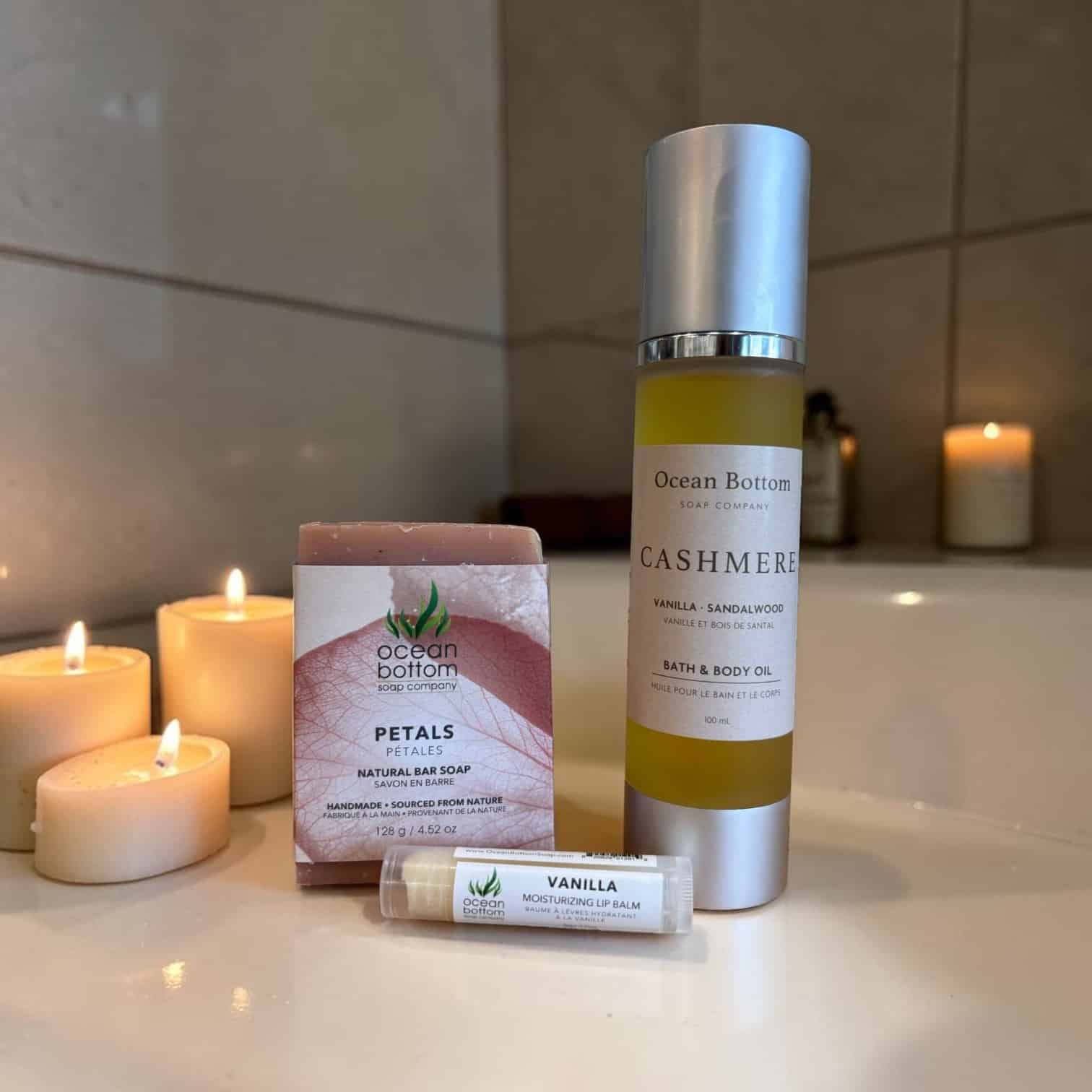 Cashmere Bath & Body Oil (Vanilla · Sandalwood) – A lightweight botanical oil that leaves skin feeling smooth, conditioned, and delicately scented with warm, comforting notes