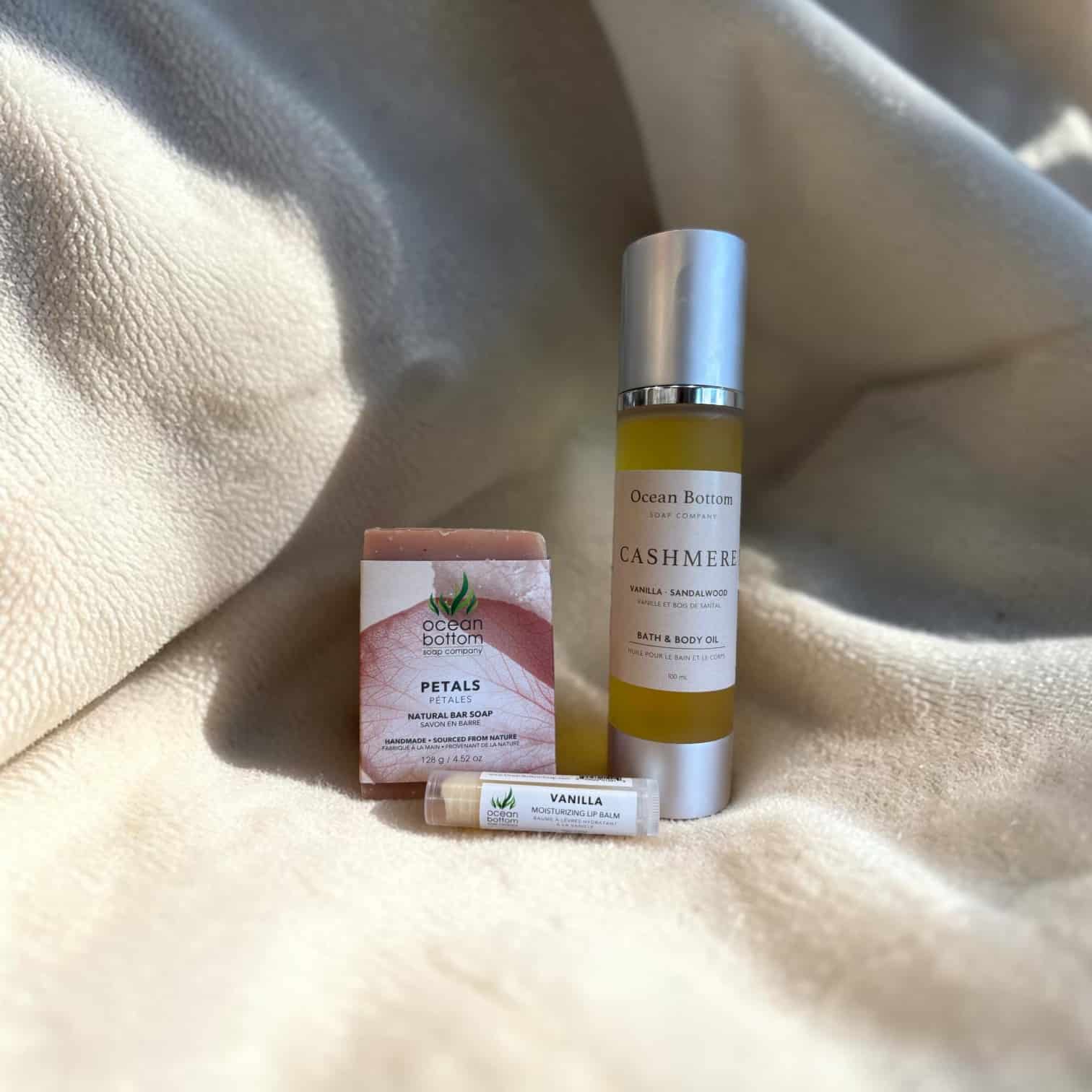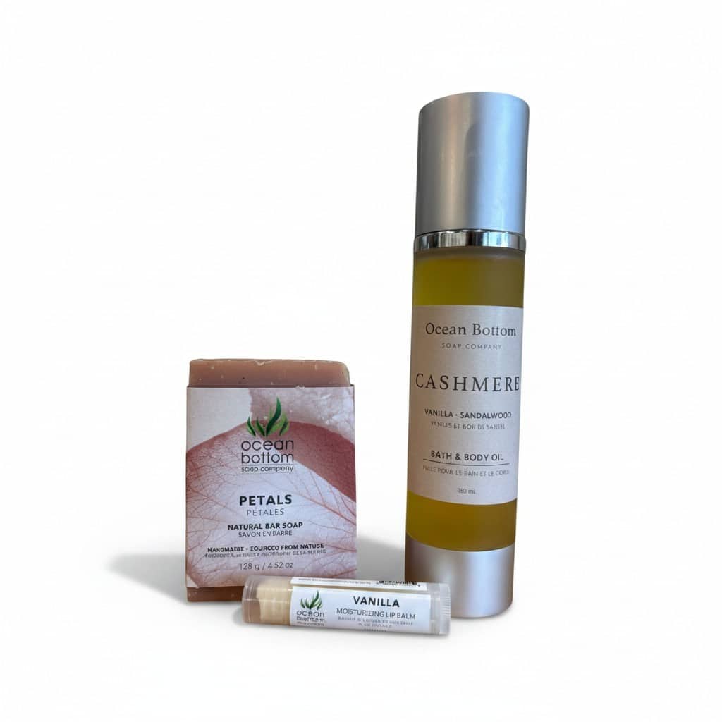A warm and comforting gift set featuring Cashmere Body Oil, Petals Soap, and a Vanilla Lip Balm. Designed to soften and nourish, Warmly Yours brings a sense of calm and everyday comfort to any routine.