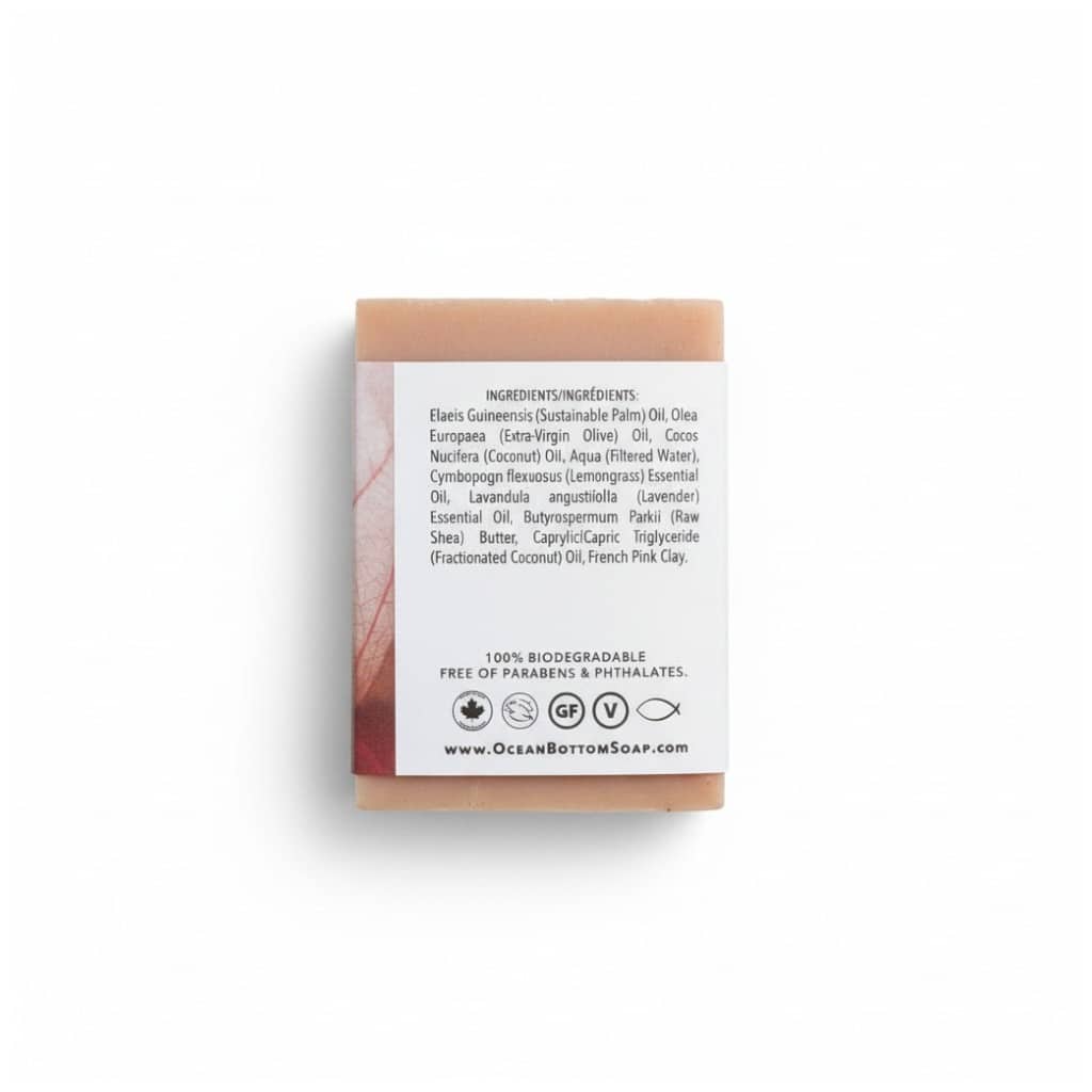 Elaeis Guineensis (Sustainable Palm) Oil, Olea Europaea (Extra-Virgin Olive) Oil, Cocos Nucifera (Coconut) Oil, Aqua (Filtered Water), Cymbopogn flexuosus (Lemongrass) Essential Oil, Lavandula angustifolia (Lavender) Essential Oil, Butyrospermum Parkii (Raw Shea) Butter, Caprylic/Capric Triglyceride (Fractionated Coconut) Oil, French Pink Clay.